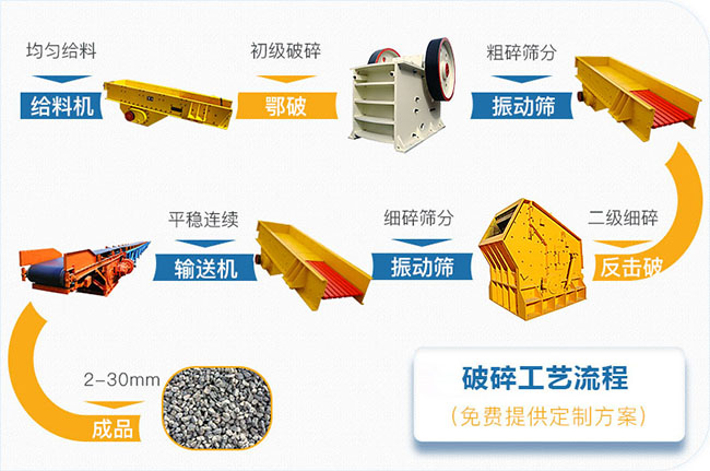 振動給料機(jī)GZD1100×4200,1臺;顎式破碎機(jī)PE750×1060,1臺;歐版反擊破PFW1214Ⅲ,2臺;圓振動篩4YZS2160,2臺。